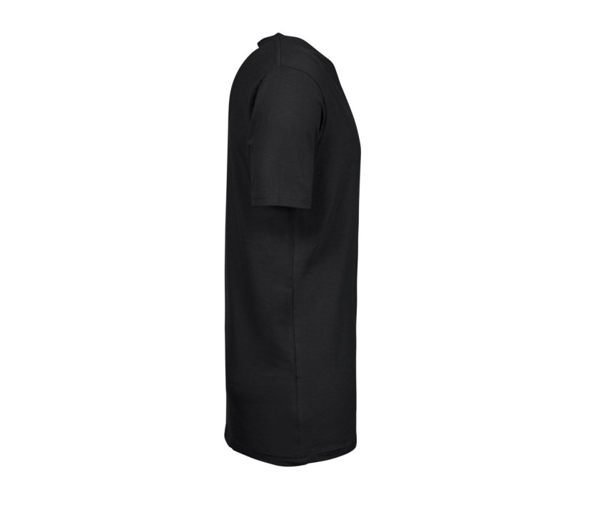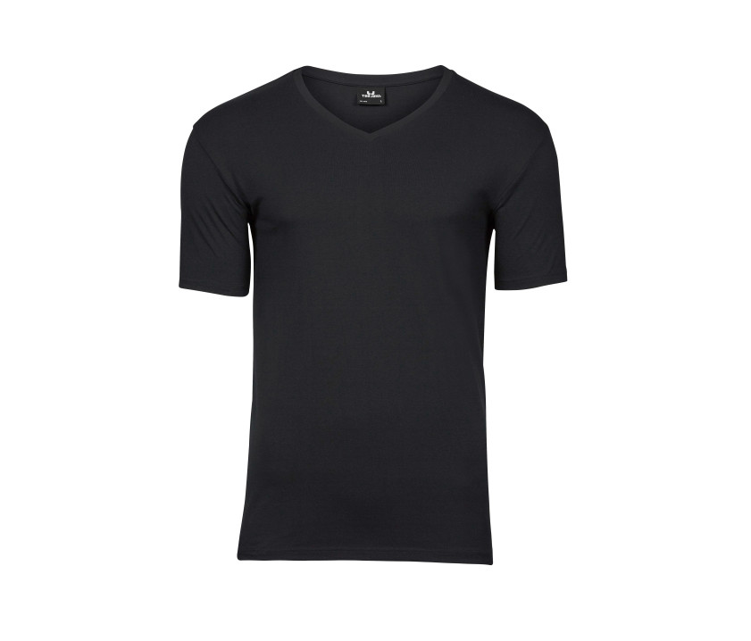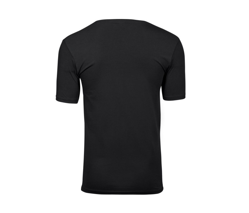 Herren-Stretch-T-Shirt mit V-Ausschnitt. Doppeltes Rippenbündchen am Halsausschnitt. Verstärkte Schultern. Nackenband. Vorgewaschen. Doppelnähte. Enzym- und Silikonwaschung.