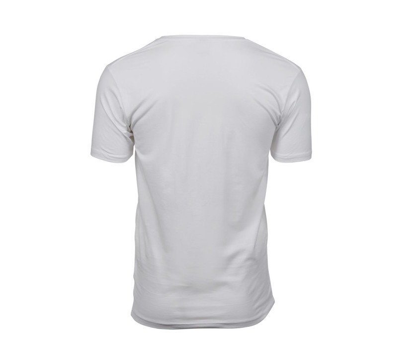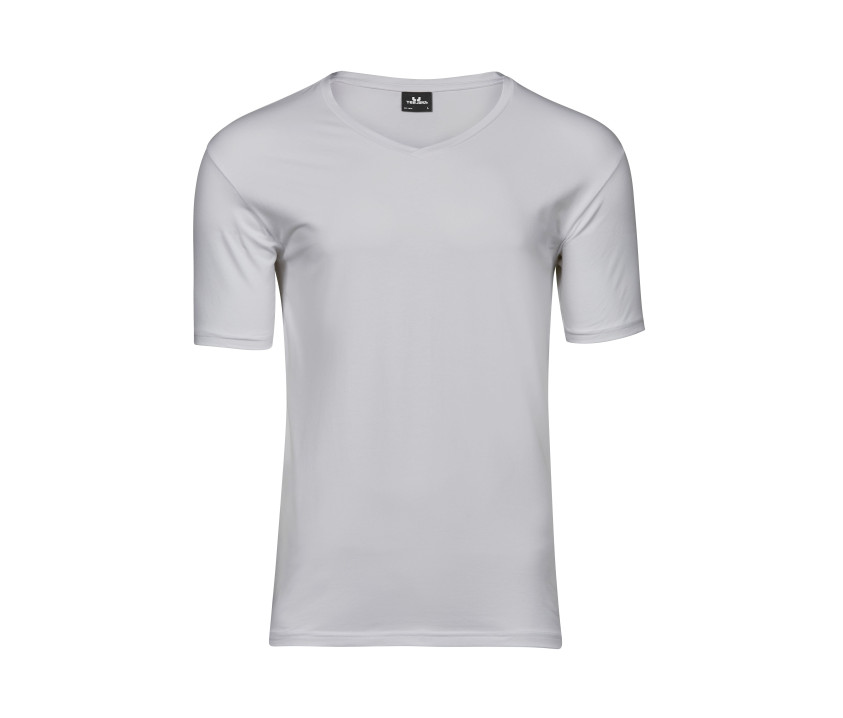 Herren-Stretch-T-Shirt mit V-Ausschnitt. Doppeltes Rippenbündchen am Halsausschnitt. Verstärkte Schultern. Nackenband. Vorgewaschen. Doppelnähte. Enzym- und Silikonwaschung.