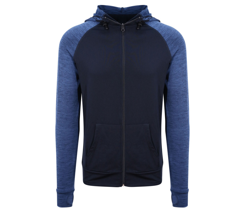 Raglanärmel in Kontrastfarben. Sportliche Passform. Im Rücken abgerundeter Saum. Schnell trocknend. Verstellbare Kapuze. Kängurutasche. Durchgehender Reißverschluss. Daumenlöcher.