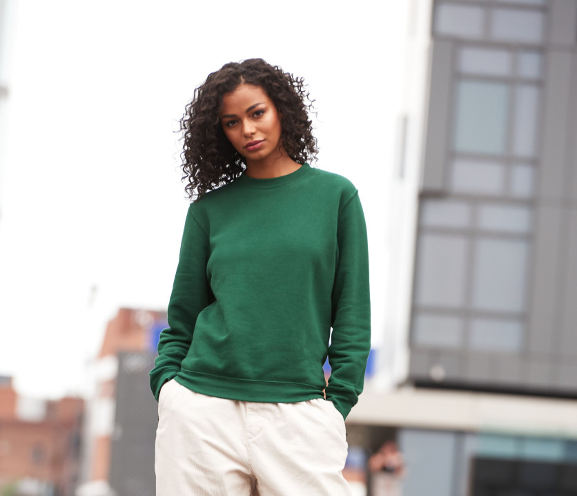 Rundhals-Sweatshirt. Gerade Ärmel. Moderne Passform. Innen gebürstet. Ablösbares Etikett. Doppelnaht. Rippenbündchen an Kragen, Bund und Ärmeln. Weiche Oberfläche für ein optimales Printergebnis. Werk und Garn GOTS und GRS zertifiziert.