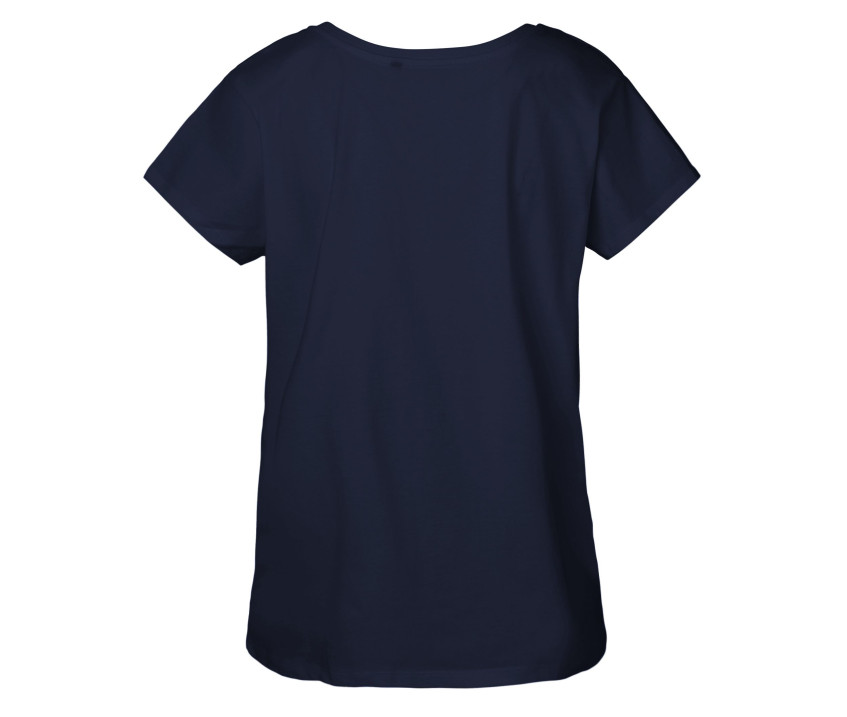 Kurzärmeliges Damen-T-Shirt. Weite Passform. Weiter Halsausschnitt. Runder Halsausschnitt. Nackenband am Kragen. GOTS, Fairtrade, EU Ecolabel, SA8000 und Oekotex zertifiziert. Produziert mit Windkraft.