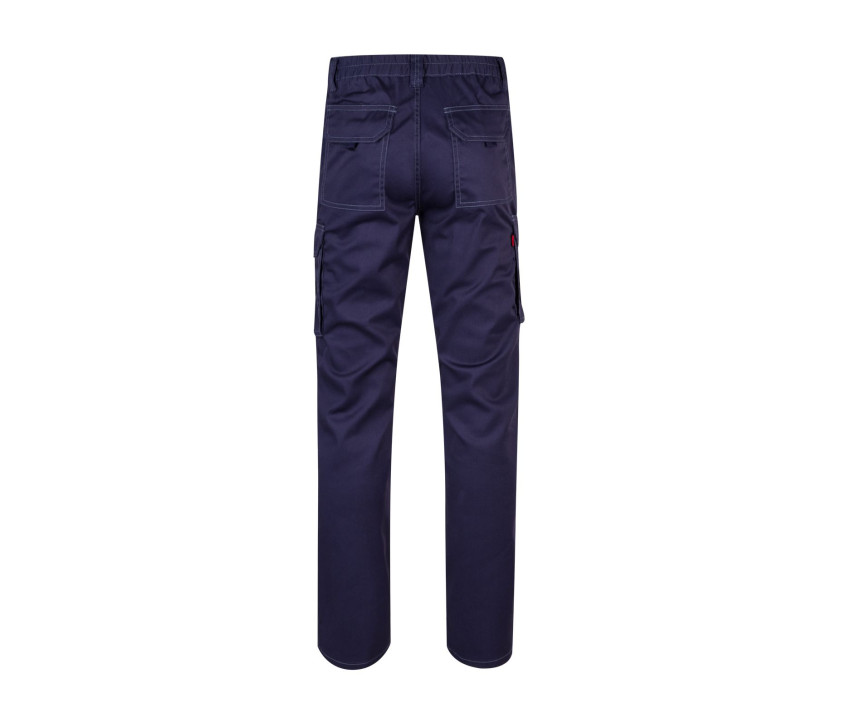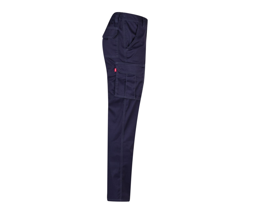 Hosenschlitz mit Knopf und Reißverschluss. Verstärkte Kontrastnähte. Elastischer Bund. 6 Taschen: 2 Seitentaschen, 2 Taschen mit doppelter Klappe, Klettverschluss und Schieber, 2 Gesäßtaschen mit Klappe und Klettverschluss.