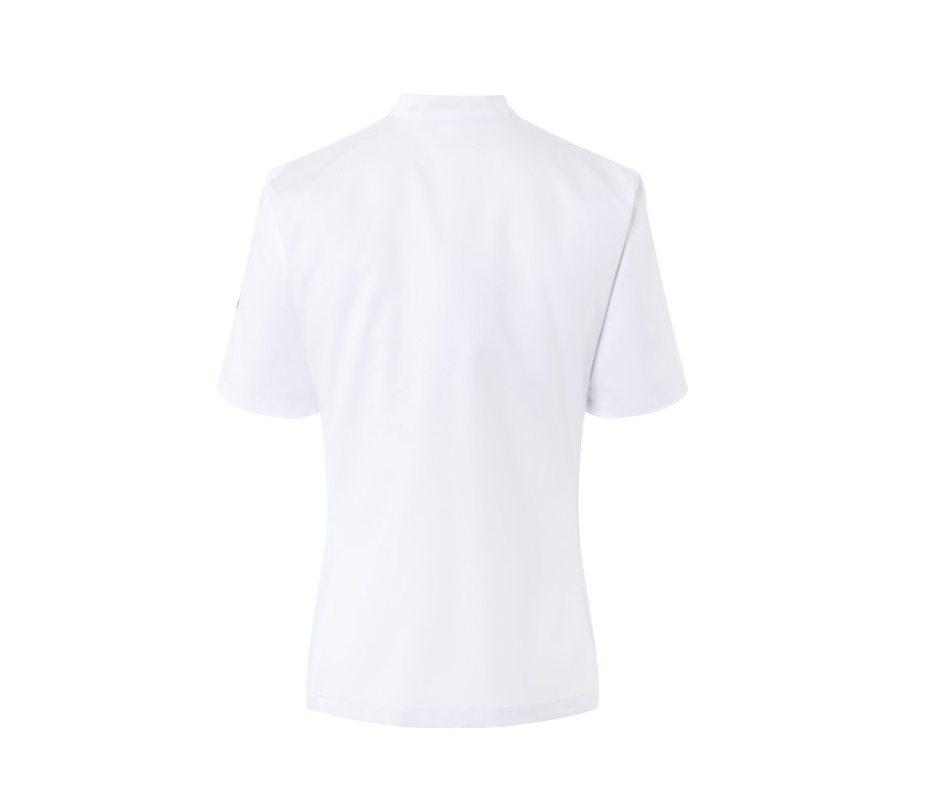 Körpernahe Passform. Brustabnäher. Flankennähte vorne und hinten. Kurze Ärmel. Aufgesetzte Brusttasche an der linken Seite. 5 Druckknöpfe. Jacke vorgewaschen, waschecht, pflegeleicht. Industriewäschetauglich.