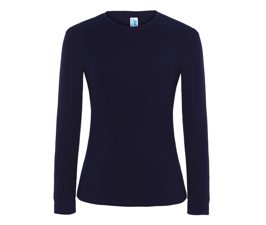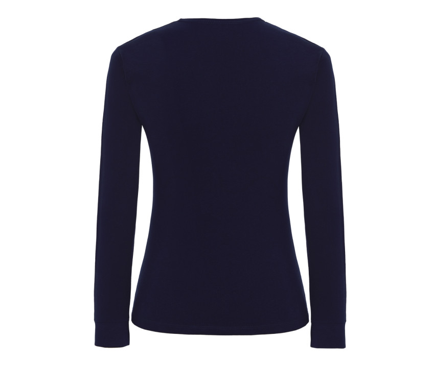 Glattes Damen-T-Shirt mit langen Ärmeln - Schlauchschnitt. Doppelte Steppnaht am Hals, Schultern und Bund. Kragen mit Rippenbündchen aus Elasthan.