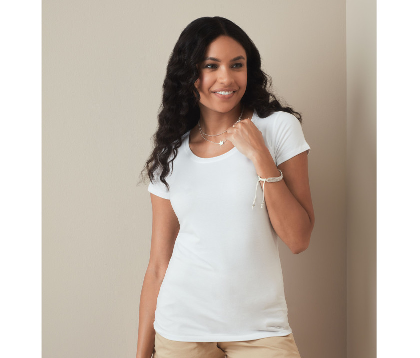 Rundhals-T-Shirt für Damen - Körpernahes T-Shirt. Kontrastiertes Nackenband. Weiter Halsauschnitt. Verstärkte Nähte an den Schultern.
