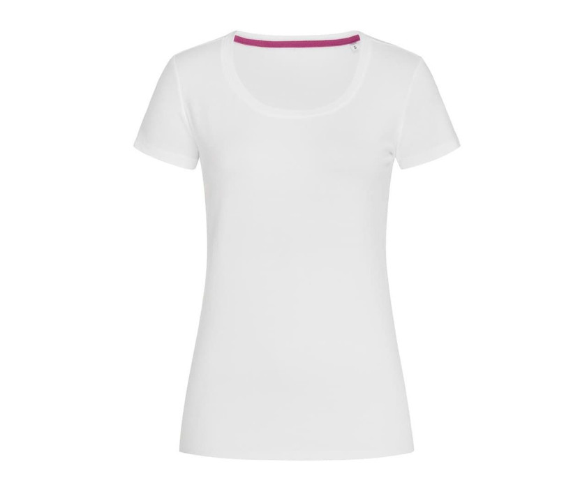 Rundhals-T-Shirt für Damen - Körpernahes T-Shirt. Kontrastiertes Nackenband. Weiter Halsauschnitt. Verstärkte Nähte an den Schultern.