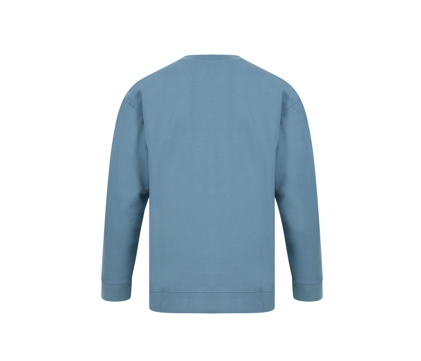 Unisex-Sweatshirt mit lässiger Passform. Gerade Ärmel. Hängende Schultern. Sweatshirt mit längerem Rückenteil. Rippenbündchen am Rundhals und an den Ärmeln. Farblich abgestimmte Steppnähte. Ablösbares Etikett. Nackenband am Kragen.