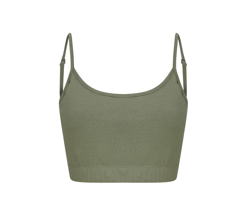 Verstellbare Spaghettiträger. Runder Hals- und Armausschnitt. Vorne mit unsichtbarem Büstenhalter gefüttert. Elastisches Band am Saum des T-Shirts. Ablösbares Etikett.