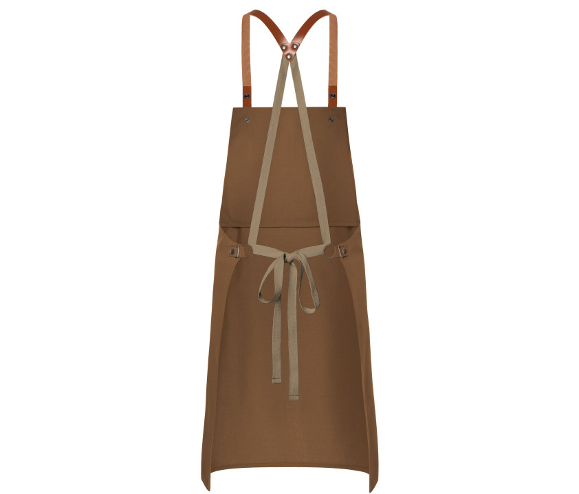 Gekreuzte Lederträger. Kontrastierte Bänder am Rücken. Mit Druckknöpfen abnehmbare Träger. Größe: 70x85 cm.
