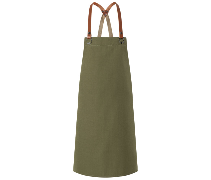 Gekreuzte Lederträger. Kontrastierte Bänder am Rücken. Mit Druckknöpfen abnehmbare Träger. Größe: 70x85 cm.