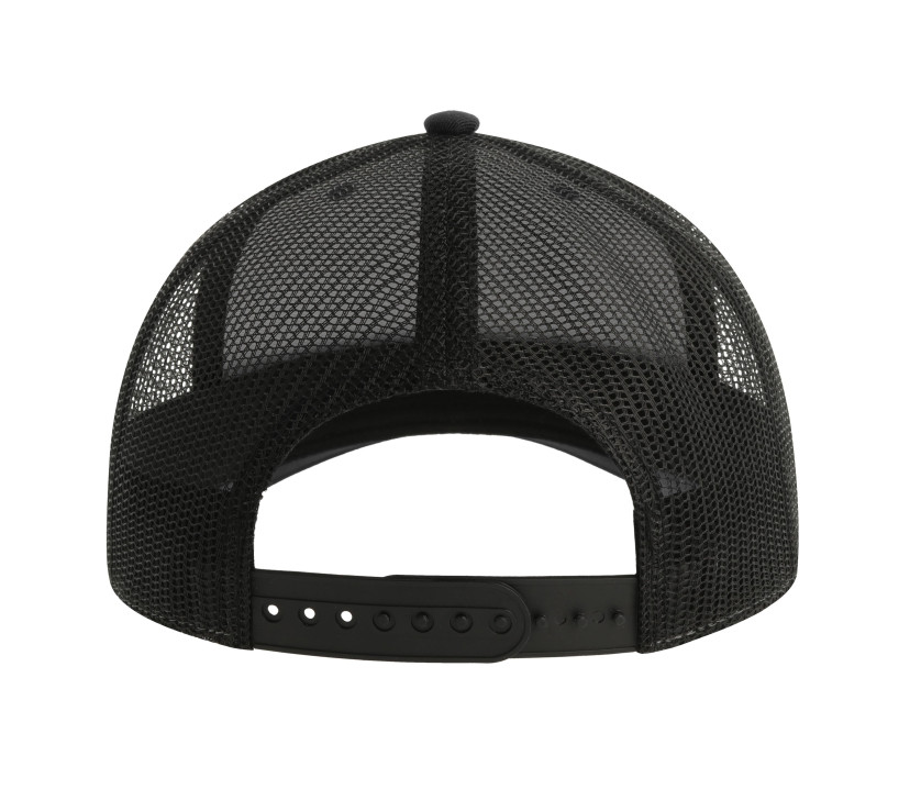 Recyceltes Polyester-Netz. Verschluss mit Band. Leicht und atmungsaktiv. Kopfumfang: 58cm. Schirm mit Kunststoffkernstruktur gefertigt.