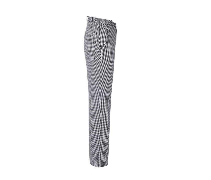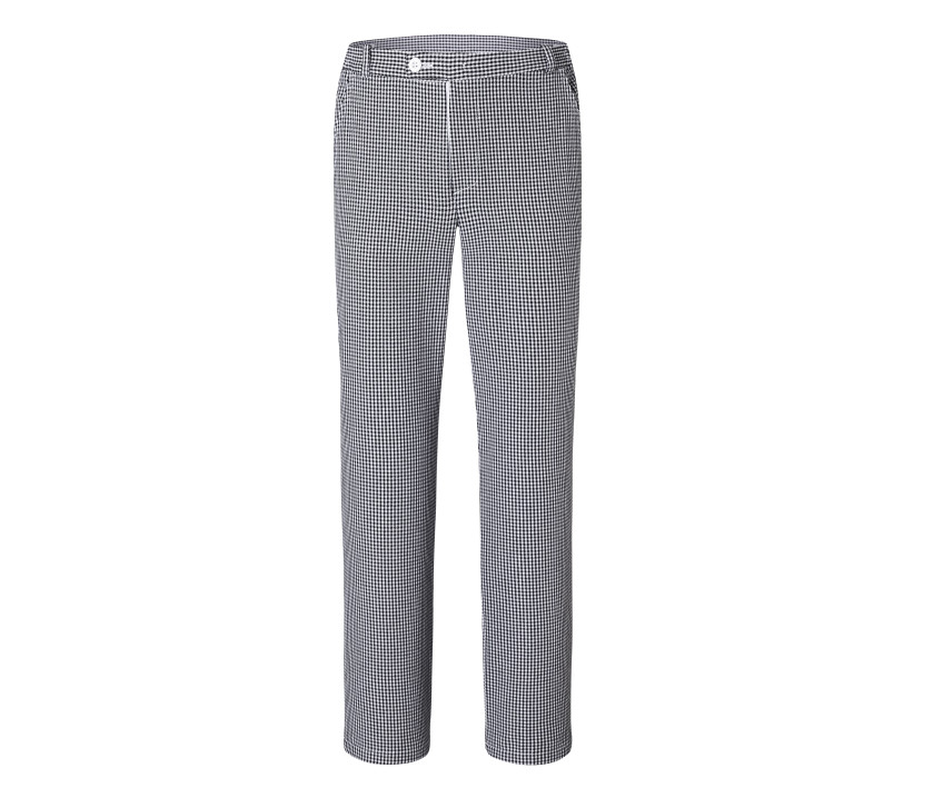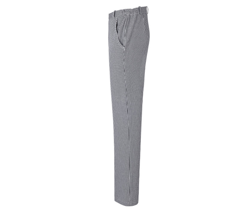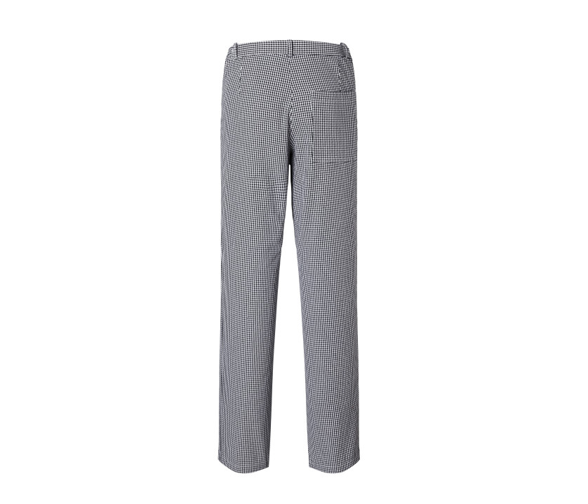 - Robuste und pflegeleichte Arbeitshose für Herren mit klassischem Pepitamuster. Elastischer Bund an den Seiten. 2 Seitentaschen. 1 Gesäßtasche rechts.