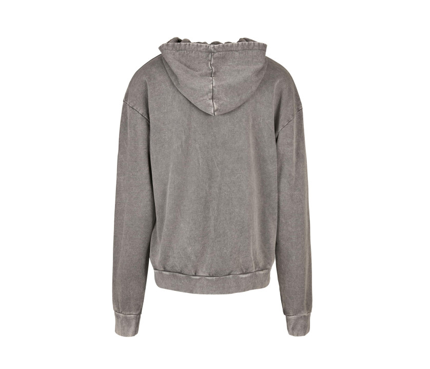 Mit Säure entfärbt. Hängende Schultern. Ohne Kordelzug an der Kapuze. Naht, die die Kapuze des Sweatshirts teilt. Lockerer Schnitt. Rippbündchen an Ärmeln und Taille. French Terry.