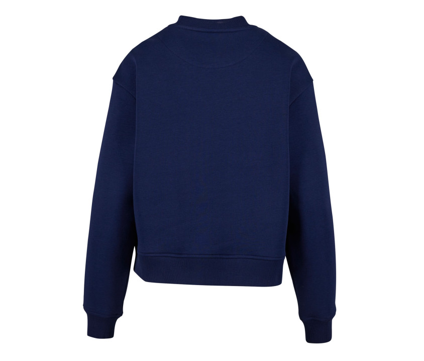 Breite Rippbündchen an Ärmeln und Saum. Überschnittene Schultern. Nur Größenlasche.