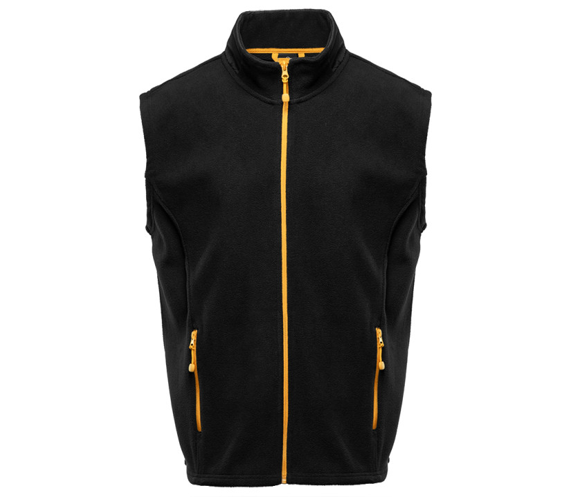Bodywarmer aus Polarfleece in Kontrastfarbe - Kontrastierender Reißverschluss. Fischgrätband am Hals. Reißverschlusstaschen mit Kunststoffpuller.