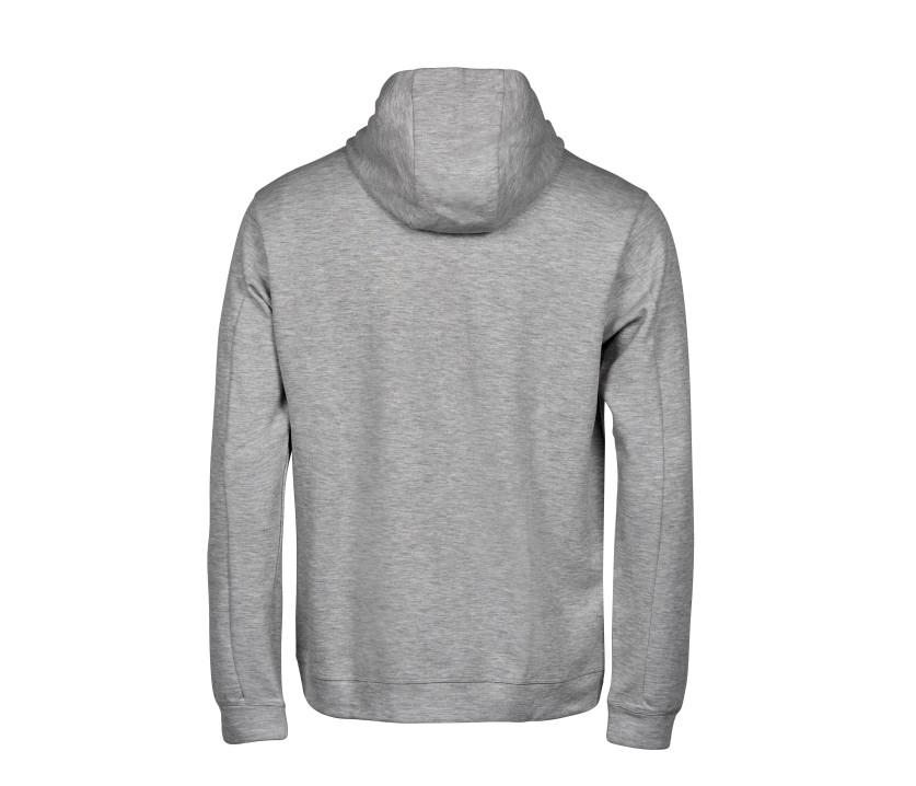 Gefütterte Kapuze. Großer Känguru-Beutel. Reißverschlusstasche am Ärmel. Ärmelbündchen aus gleichem Stoff. Gerade Ärmel.