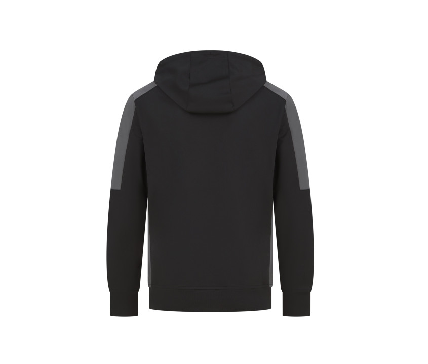 Innen gebürstet. Seitentaschen mit Reißverschluss. Ärmel und Seiteneinsätze in Kontrastfarbe. Gerripte Bündchen. Ausschnitt gekreuzt. Paspeltasche mit Reißverschluss in der Seitennaht. Kapuze 3-teilig.