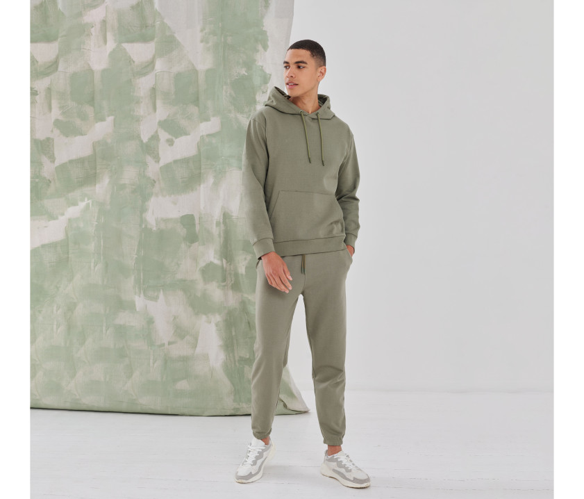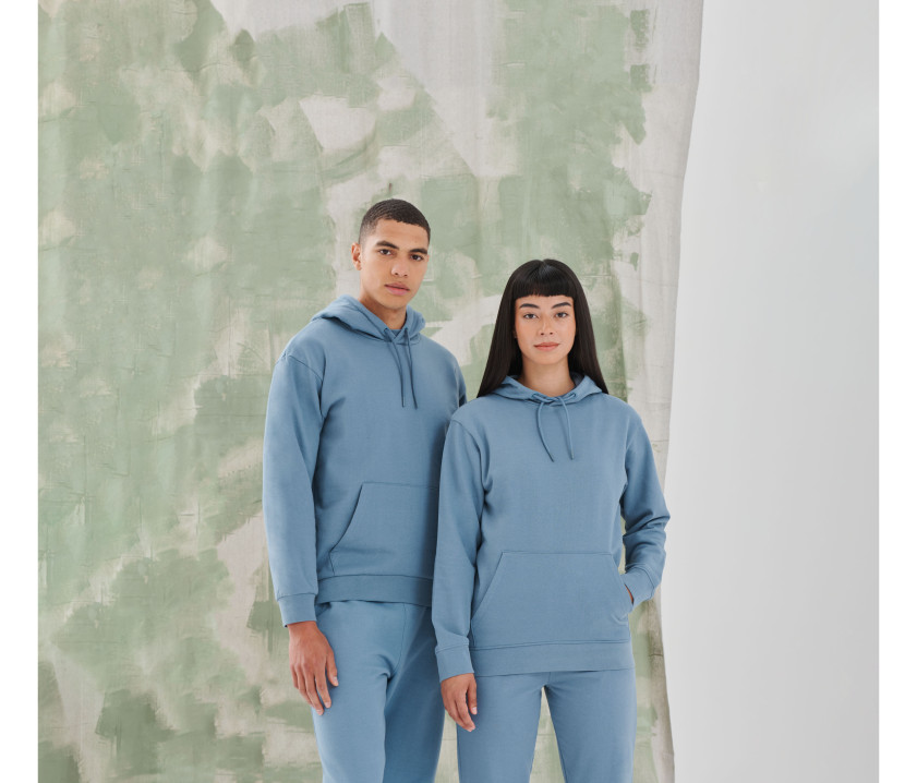 Gerade Ärmel. Hängende Schultern. Längerer Rücken. Taille und ärmelbündchen. Sauberkeitsband am Kragen. Ton-in-Ton-Kordelzug. Känguru-Beutel. Ton-in-Ton-Nähte. Innen gebürstet.