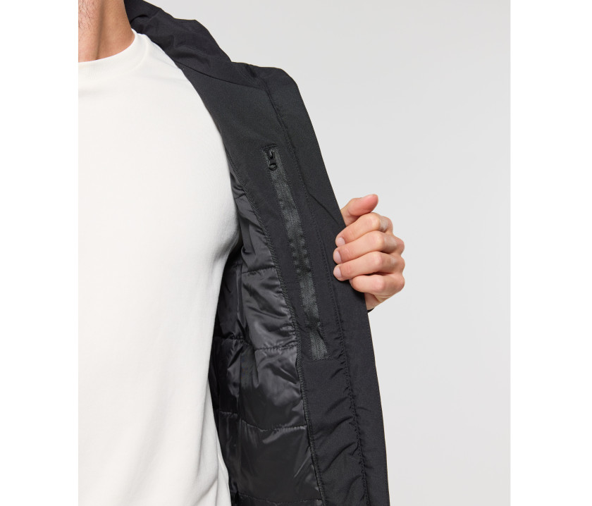 Leichte wasserdichte Jacke. Mit wasserdichten Reißverschlüssen. Elastische Rippstrickbündchen an Ärmeln und Saum. Innenfutter aus recyceltem Polyester. Wasserdichtigkeit: 4000-5000mm.
