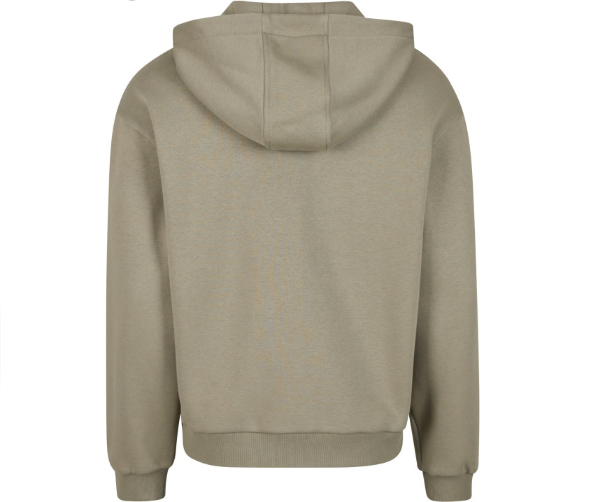 Überdimensionale Passform. Überschnittene Schultern. Kängurutasche. Geripptes Bündchen an Saum und Ärmelsaum. Metall-Reißverschluss. Innen gebürstet.
