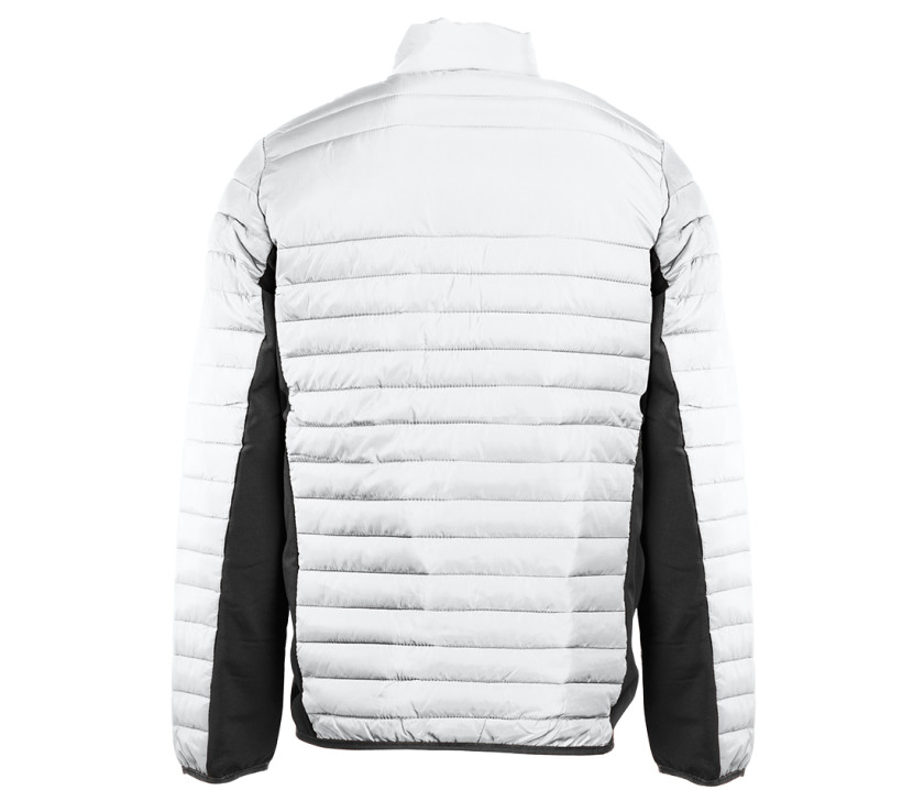 Leichte, modische Daunenjacke aus Bi-Material, anliegende Passform. 2 Seitentaschen mit Reißverschluss. 2 Innentaschen. Kinnschutz. Kontrastierte Reißverschlüsse. Druckfläche vorne 9 cm und hinten 12 cm.