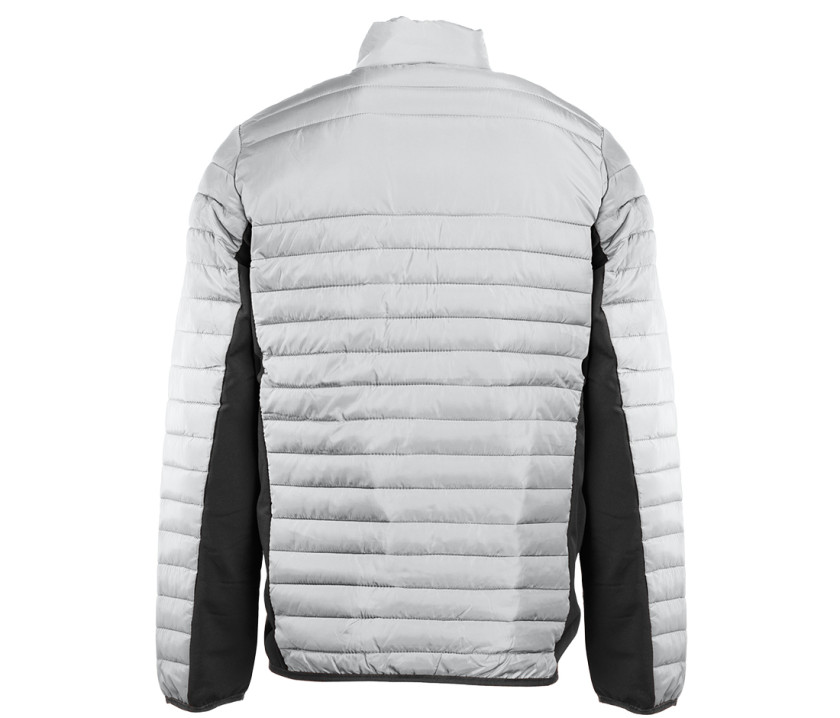 Leichte, modische Daunenjacke aus Bi-Material, anliegende Passform. 2 Seitentaschen mit Reißverschluss. 2 Innentaschen. Kinnschutz. Kontrastierte Reißverschlüsse. Druckfläche vorne 9 cm und hinten 12 cm.