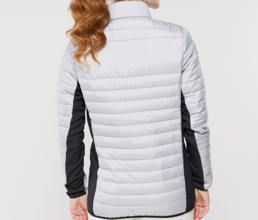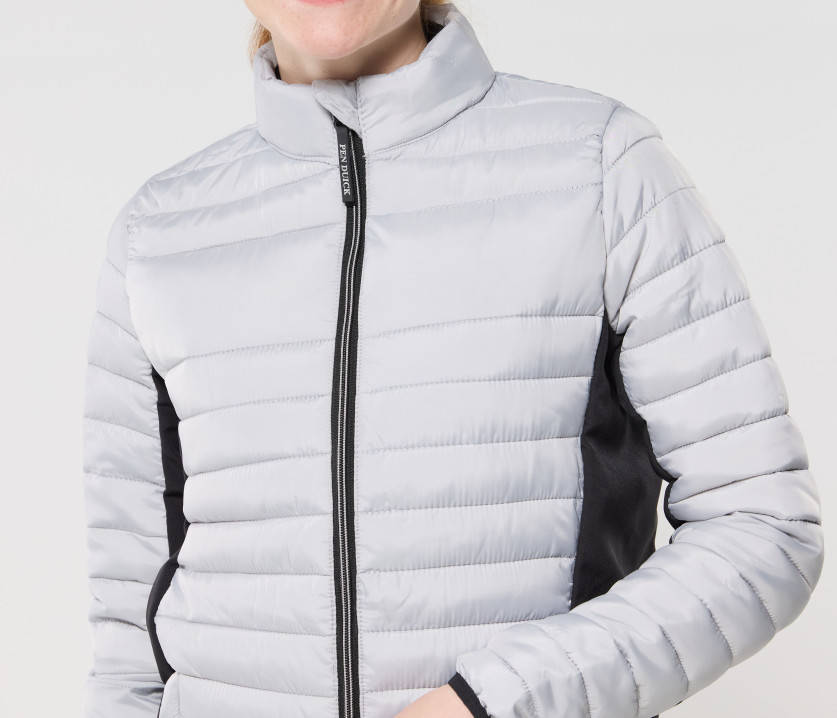 Leichte, modische Daunenjacke aus Bi-Material, anliegende Passform. 2 Seitentaschen mit Reißverschluss. 2 Innentaschen. Kinnschutz. Kontrastierte Reißverschlüsse. Druckfläche vorne 9 cm und hinten 12 cm.