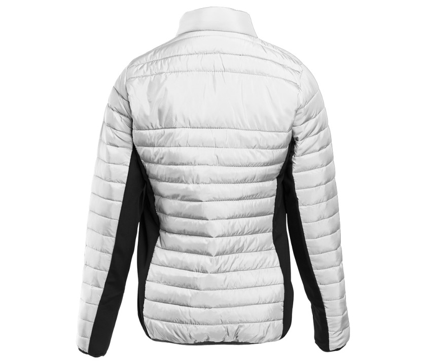 Leichte, modische Daunenjacke aus Bi-Material, anliegende Passform. 2 Seitentaschen mit Reißverschluss. 2 Innentaschen. Kinnschutz. Kontrastierte Reißverschlüsse. Druckfläche vorne 9 cm und hinten 12 cm.