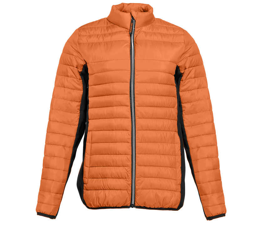 Leichte, modische Daunenjacke aus Bi-Material, anliegende Passform. 2 Seitentaschen mit Reißverschluss. 2 Innentaschen. Kinnschutz. Kontrastierte Reißverschlüsse. Druckfläche vorne 9 cm und hinten 12 cm.