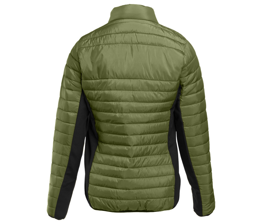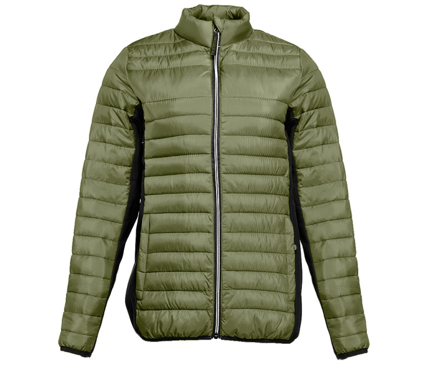 Leichte, modische Daunenjacke aus Bi-Material, anliegende Passform. 2 Seitentaschen mit Reißverschluss. 2 Innentaschen. Kinnschutz. Kontrastierte Reißverschlüsse. Druckfläche vorne 9 cm und hinten 12 cm.
