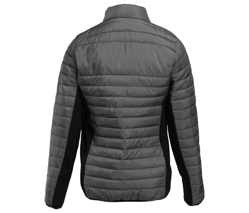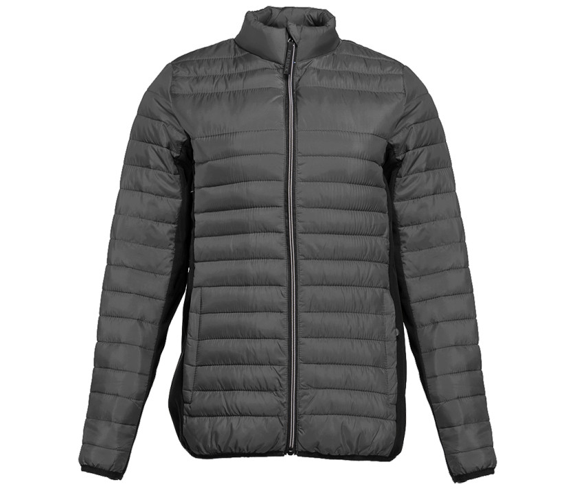 Leichte, modische Daunenjacke aus Bi-Material, anliegende Passform. 2 Seitentaschen mit Reißverschluss. 2 Innentaschen. Kinnschutz. Kontrastierte Reißverschlüsse. Druckfläche vorne 9 cm und hinten 12 cm.