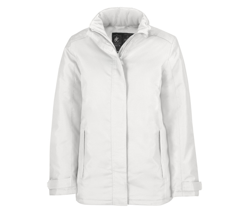 Wasserdicht bis 1000 mm und winddicht. Reißverschluss vorne unter Klappe, Klettverschluss mit Kinnschutz. 2 Taschen vorne mit Reißverschluss unter Klappe. 3-teilige faltbare Kapuze. 1 Innentasche mit Reißverschluss. Bündchen mit Klettverschlussband. Fütterung und Accessoires farblich passend. Anliegende weibliche Passform. Zugriff für die Personalisierung.