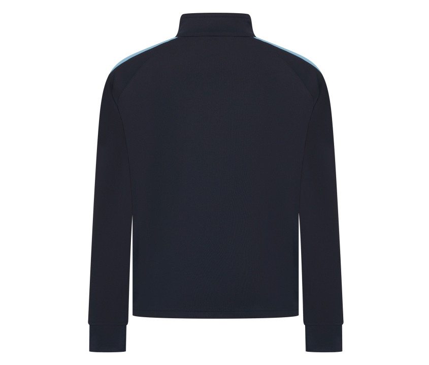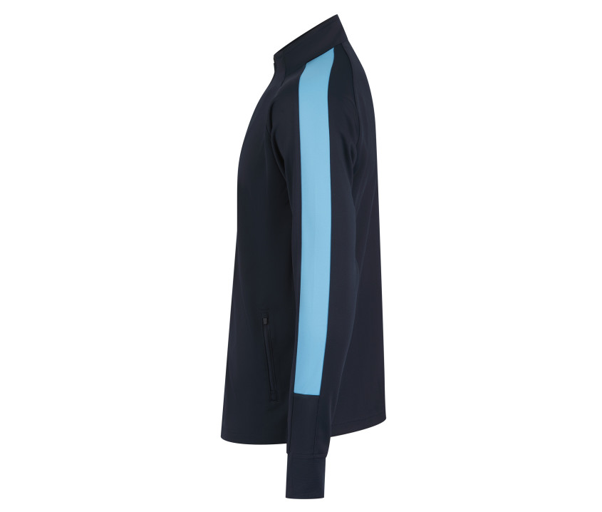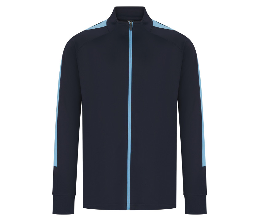 Jacke mit durchgehendem Reißverschluss kontrastiert. Kontraststreifen Schultern und Ärmel. Seitentaschen mit Reißverschluss. Ärmel mit 1x1-Rippenbündchen. Stehkragen.