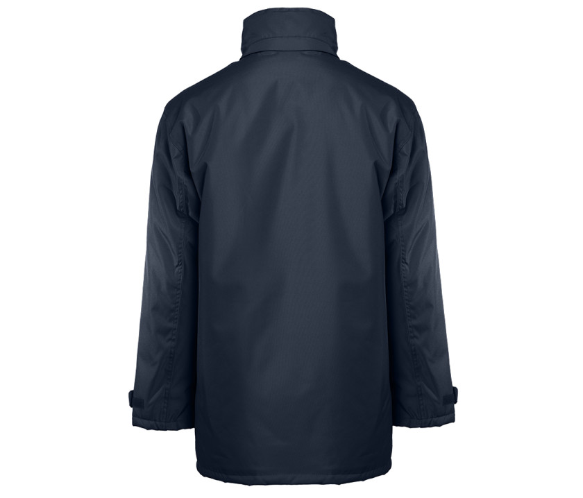 Winddicht mit wasserdichter Beschichtung 1000mm. Kragen mit Fleece-Futter. Klettverschluss an den Ärmeln. 2 Außentaschen mit Reißverschluss. 2 Innentaschen (Geldbeutel und Handy). Kapuze im Kragen. Zugriff für die Personalisierung (linke Seite und Rücken).
