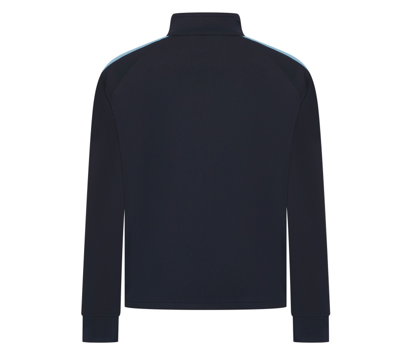 Jacke mit durchgehendem Reißverschluss kontrastiert. Kontraststreifen Schultern und Ärmel. Seitentaschen mit Reißverschluss. Ärmel mit 1x1-Rippenbündchen. Stehkragen.