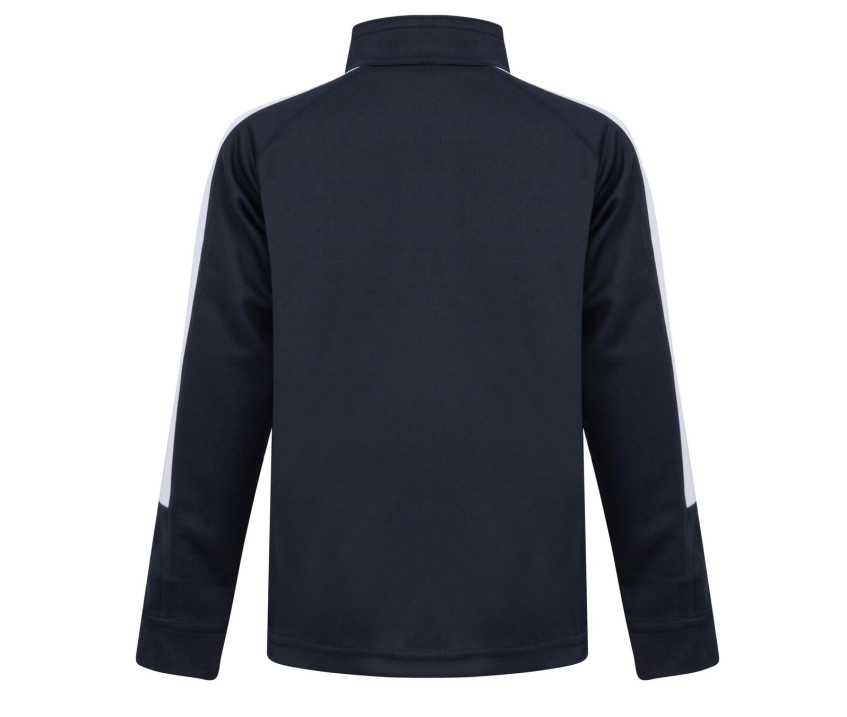 Jacke mit durchgehendem Reißverschluss kontrastiert. Kontraststreifen Schultern und Ärmel. Seitentaschen mit Reißverschluss. Ärmel mit 1x1-Rippenbündchen. Stehkragen.
