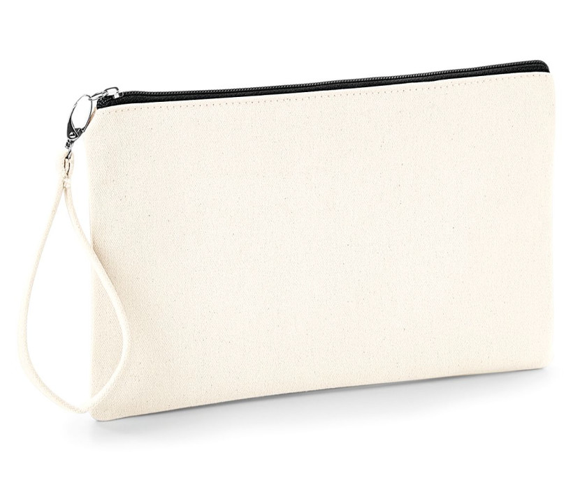 Mehrzweck-Täschchen. Schwere Premium-Baumwolle. Kontrastierter Reißverschluss. Abnehmbare Handschlaufe, Länge: 15 cm. Bedruckbare Fläche: 21x13 cm.