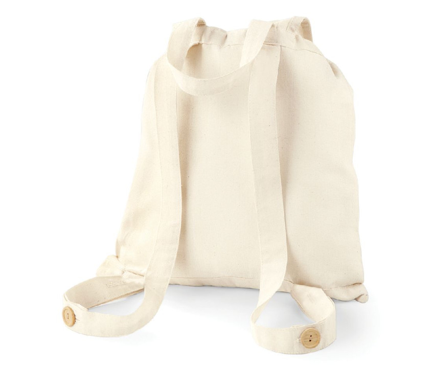 Baumwolle zertifiziert durch Control Union. Verschluss per Kordel. Holzknöpfe. Verstellbare Schulterriemen. Tragegriff. Bedruckbare Fläche 20x28 cm.