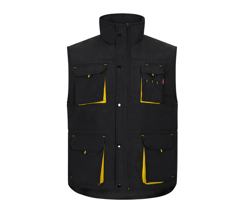 Durchgehender Reißverschluss. Klappe mit Druckknöpfen. Einsätze Windjacke an den Armausschnitten. Faltenbalge der Taschen kontrastiert. Zieher kontrastiert. 7 Taschen: 1 Brusttasche mit Faltenbalg und Klappe, Zieher und Klettverschluss. 2 Vordertaschen mit Faltenbalg und Klappe, Zieher und Klettverschluss und unter jeder 2 Seitentaschen. 1 Brusttasche mit Faltenbalg, mit Klappe, Klettverschluss, Ziehern und Stiftfächern. 1 aufgesetzte Innentasche.
