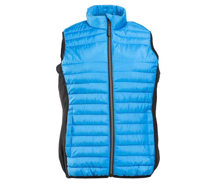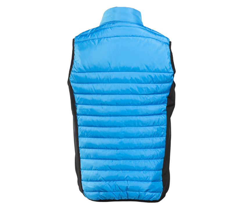Leichter, modischer Bodywarmer aus Bi-Material. 2 Seitentaschen mit Reißverschluss. Kinnschutz. Kontrastierte Reißverschlüsse. Druckfläche vorne 9 cm und hinten 12 cm.