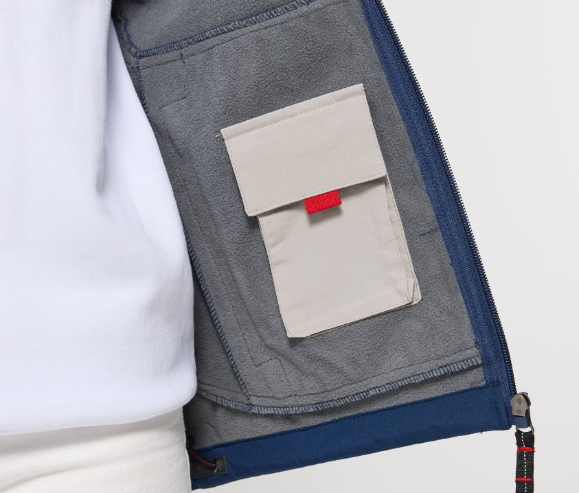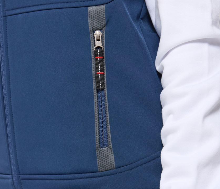 Softshell-Weste, sehr leicht. 3-schichtiger Stoff mit atmungsaktiver Membran befestigt (800g) und wasserdicht (3000-5000mm). 2 Reißverschlusstaschen. Gummiband unten mit Stoppern. Innenmaterial aus Microfleece. Anliegende Passform.