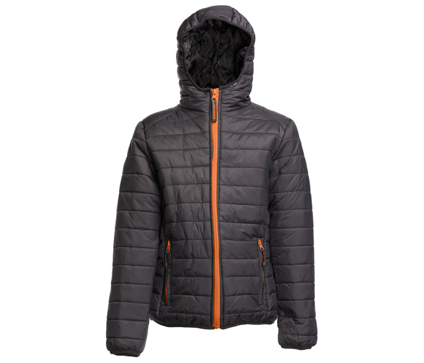 Daunenjacke mit Kapuze. Winddicht und wasserabweisend. 2 Seitentaschen mit Lasche. Große Innentasche mit Reißverschluss. Innentasche mit Klettverschluss. Bündchen und Saum elastisch. Höhe zwischen den Schnitten: 4 cm.
