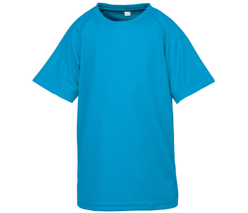 Leichtes Kinder-T-Shirt, atmungsaktiv, schnell trocknend. Ohne Markenetikett. Raglanärmel. Sehr gute Elastizität und guter Halt. Weite Passform.