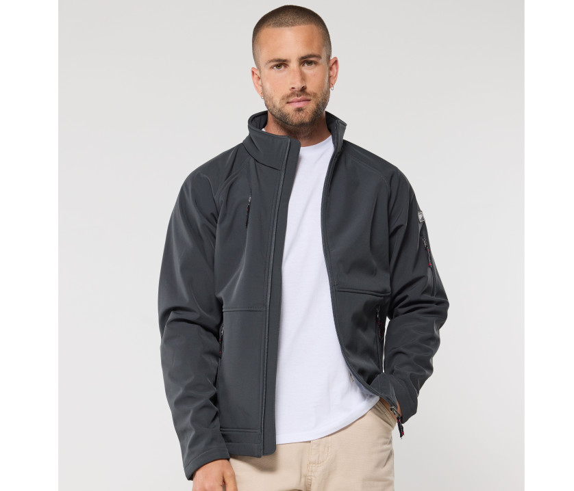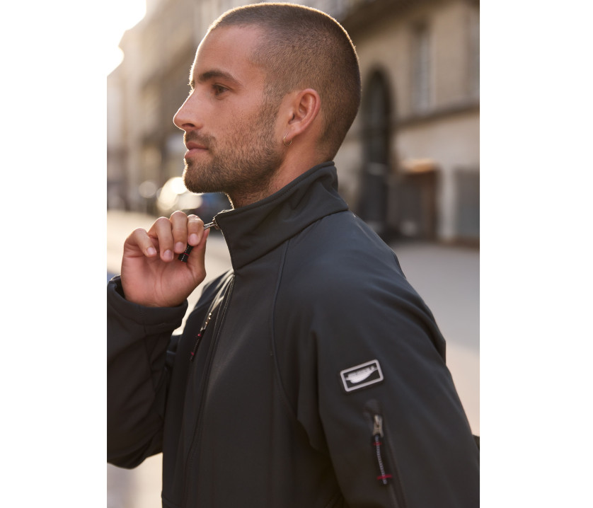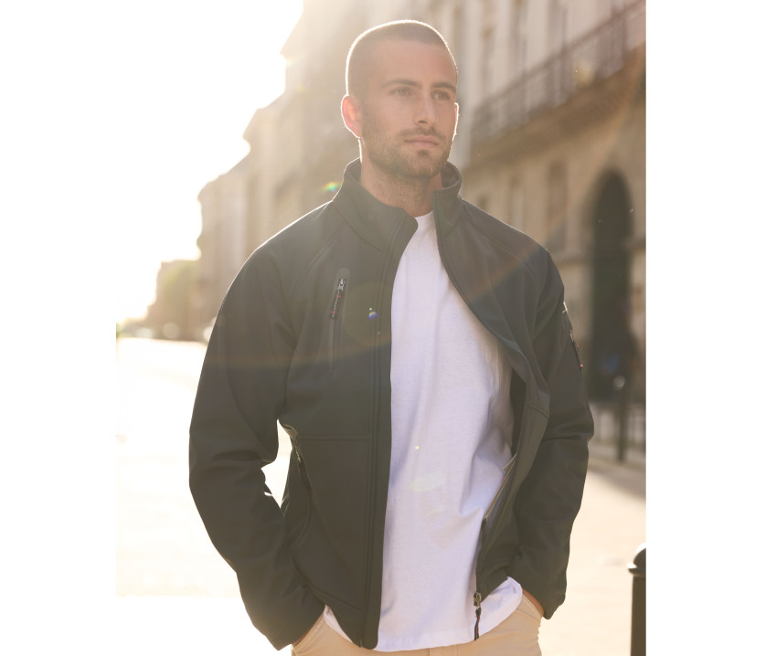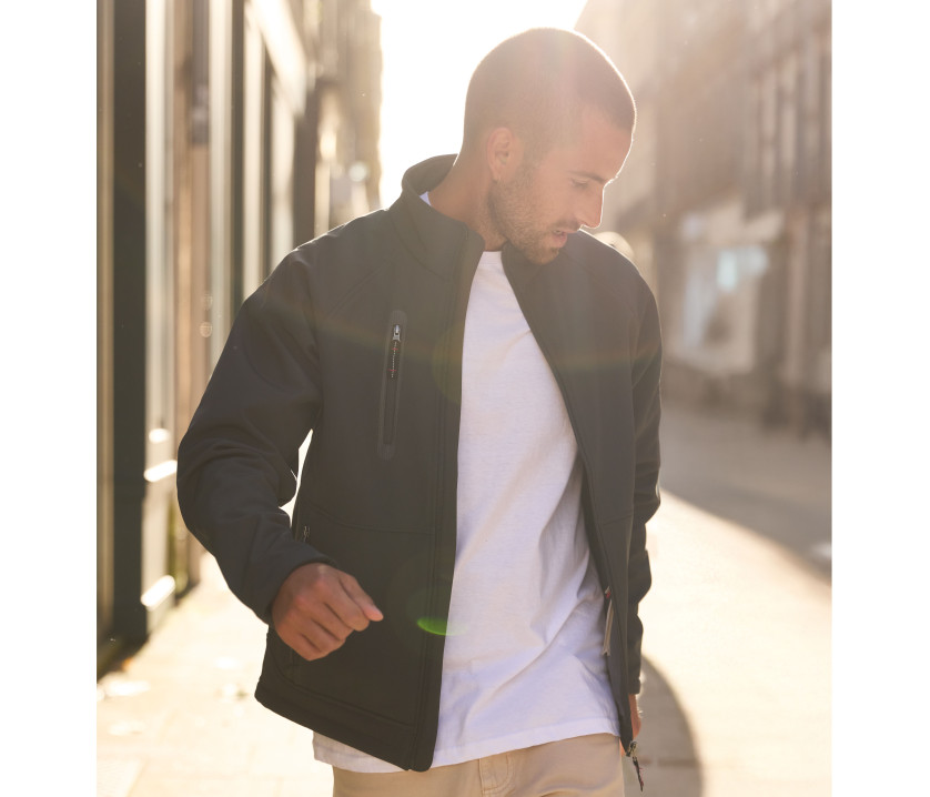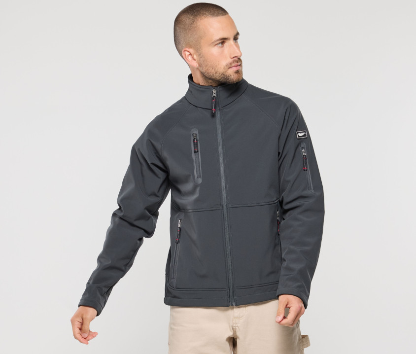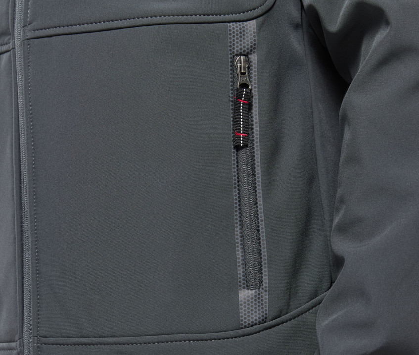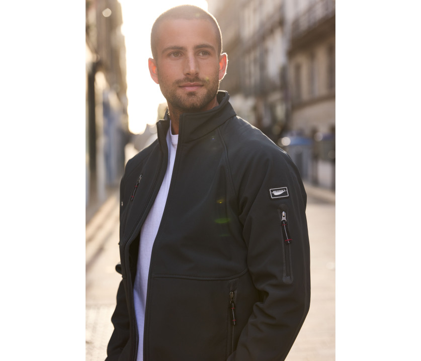 Softshell-Jacke, sehr leicht. 3-schichtiger Stoff mit atmungsaktiver Membran befestigt (800g) und wasserdicht (3000-5000mm). Innenmaterial aus Microfleece. 3 Außentaschen mit Reißverschluss. Gummiband unten mit Stopper. Anliegende Passform. 1 Reißverschlusstasche am Arm. Modell Bodywarmer PK765 Seite 187.