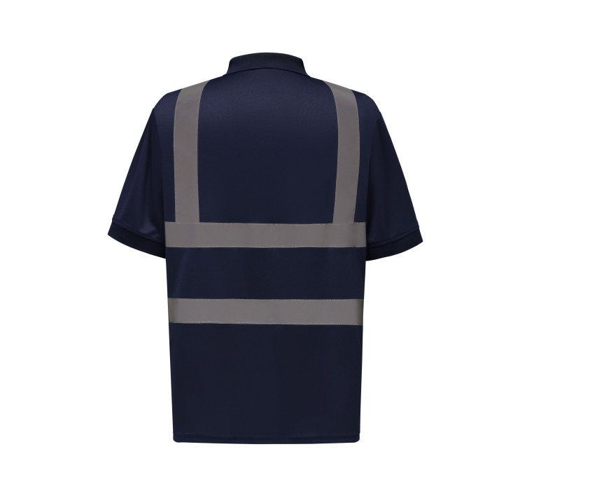 Hi-Vis kurzärmeliges Polohemd - 2 Längsstreifen und 2 Querstreifen, reflektierend, 3M, angenäht, 5 cm. Kragen und Armausschnitte in Navy-Farbe an den Modellen Hi-Vis Yellow und Hi-Vis Orange. Knopfleiste mit 3 farblich passenden Knöpfen. Die Farbtöne Hi-Vis Yellow und Hi-Vis Orange entsprechen der Zertifizierung EN ISO20471:2013 Klasse 2.