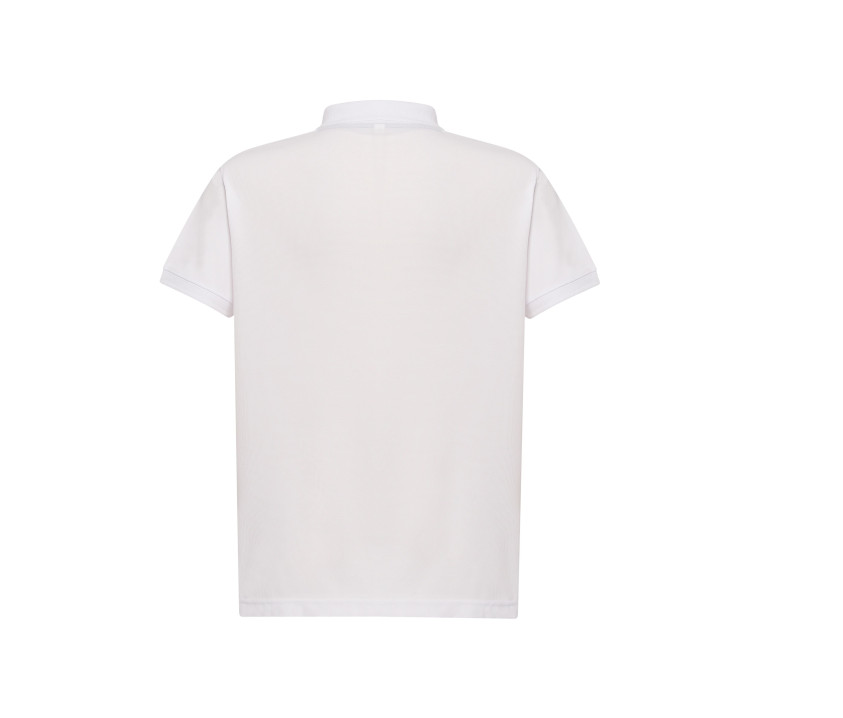 Piqué. Knopfleiste mit 3 farblich passenden Knöpfen. Nackenband in Kontrastfarbe. Seitliche Schlitze in Kontrastfarbe.