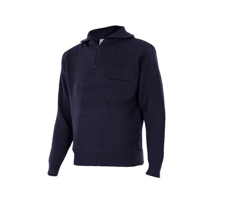 Gauge 7. Anti-Pilling. Stehkragen mit Reißverschluss. Verstärktes Gewebe an Schultern und Ellenbogen. Rippenbündchen an Kragen, Ärmelabschlüssen und Bund. Brusttasche mit Klettverschluss und Klappenöffnung für Stifte.