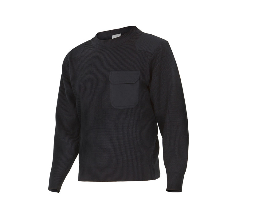 Gauge 7. Anti-Pilling. Verstärktes Gewebe an Schultern und Ellenbogen. Rippenbündchen an Kragen, Ärmelabschlüssen und Bund. Brusttasche mit Klettverschluss.