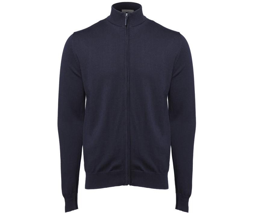 - Halsbündchen, Ärmelbündchen und Saum in Rippstrick. Gerade Ärmel. Durchgehender Reißverschluss.