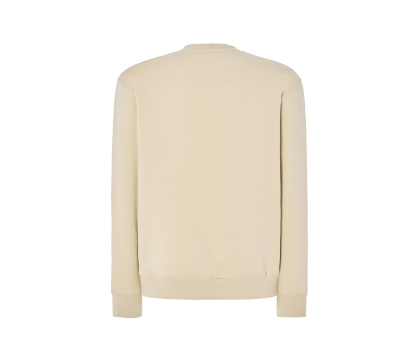 Doppelnaht Kragen, Ärmel und Bund. Rand 1x1-Strick mit Lycra an Kragen, Ärmelbündchen und Bund. Runder Halsausschnitt. Gerade Ärmel. Umstellung des Lagerbestands: Polyester/Baumwolle zu Baumwolle/recyceltem Polyester.